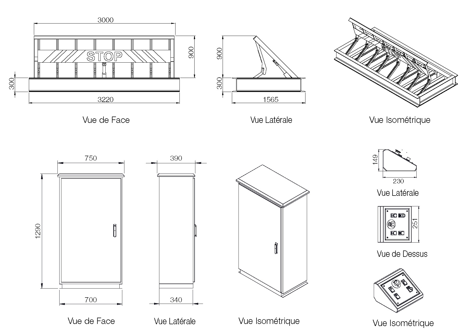 *Les dimensions sont données pour une largeur de blocage de 3000 mm, une hauteur d'obstacle de 1200 mm et une armoire de commande avec configuration standard.