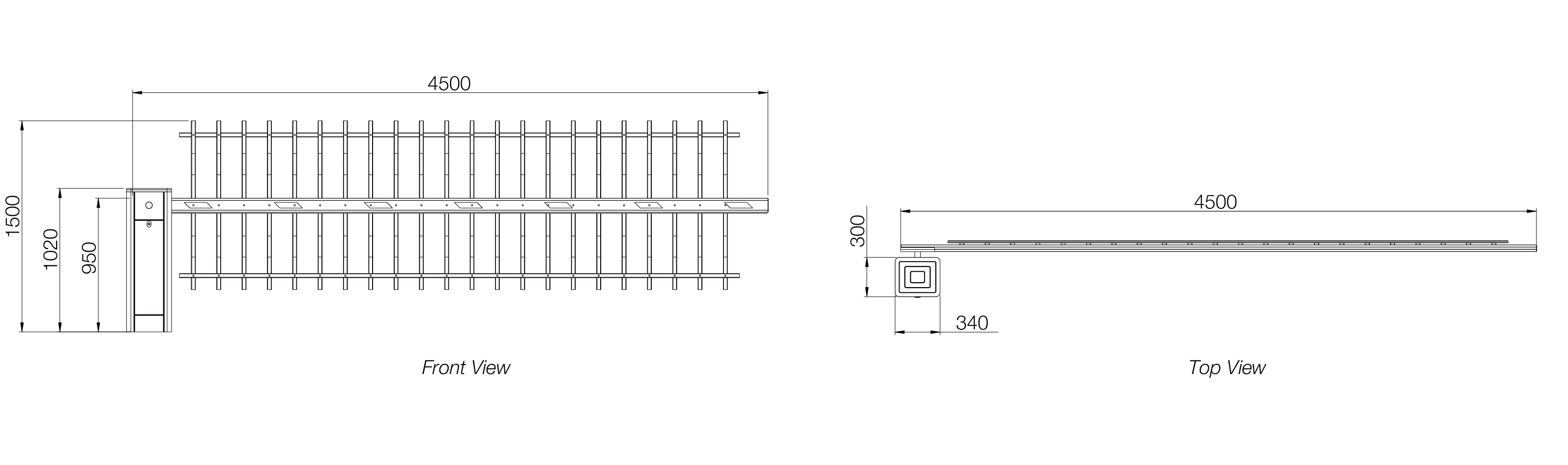 | RISING FENCE | 100x42 mm octagonal white (RAL9016) main aluminum boom with 40x20 mm horizontal and 20x10 mm vertical support bars. |